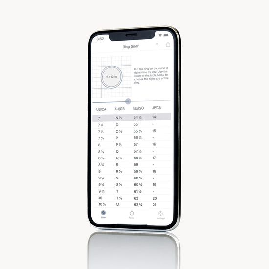 App StoreDownload the mobile application: "Ring Sizer by Jason Withers". All you need is a pre-owned ring and your phone. Available for iOS and Android.
