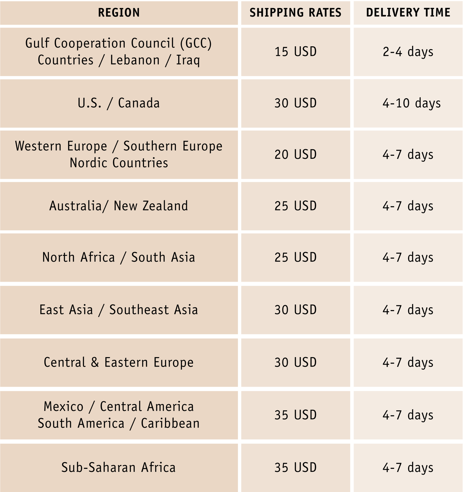 For international orders, we ship with Aramex. Rates and delivery time for each region is listed in the table on the right.
